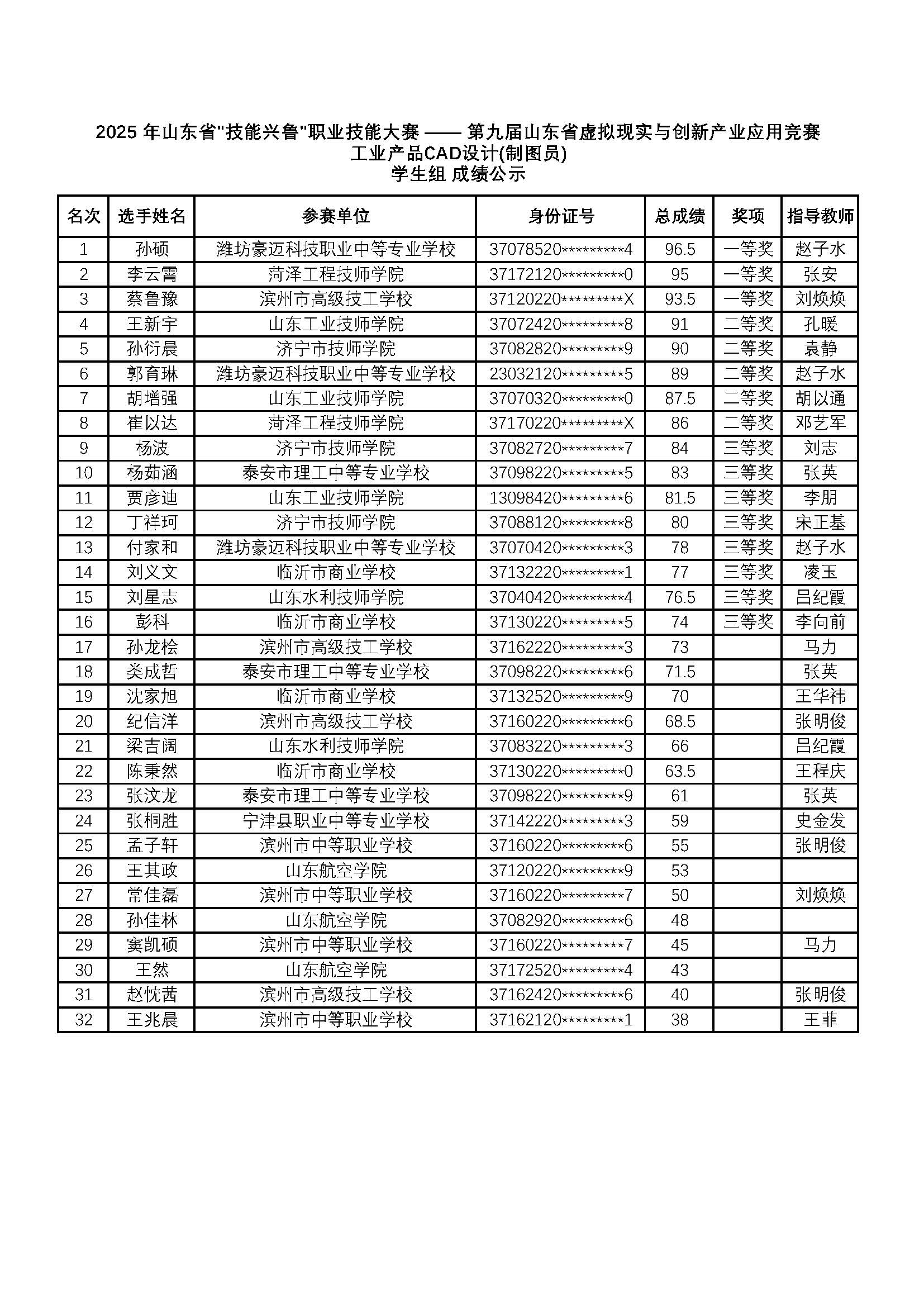2025 年山东省""技能兴鲁""职业技能大赛 —— 第九届山东省虚拟现实与创新产业应用竞赛 工业产品CAD设计(制图员) 学生组 成绩公示