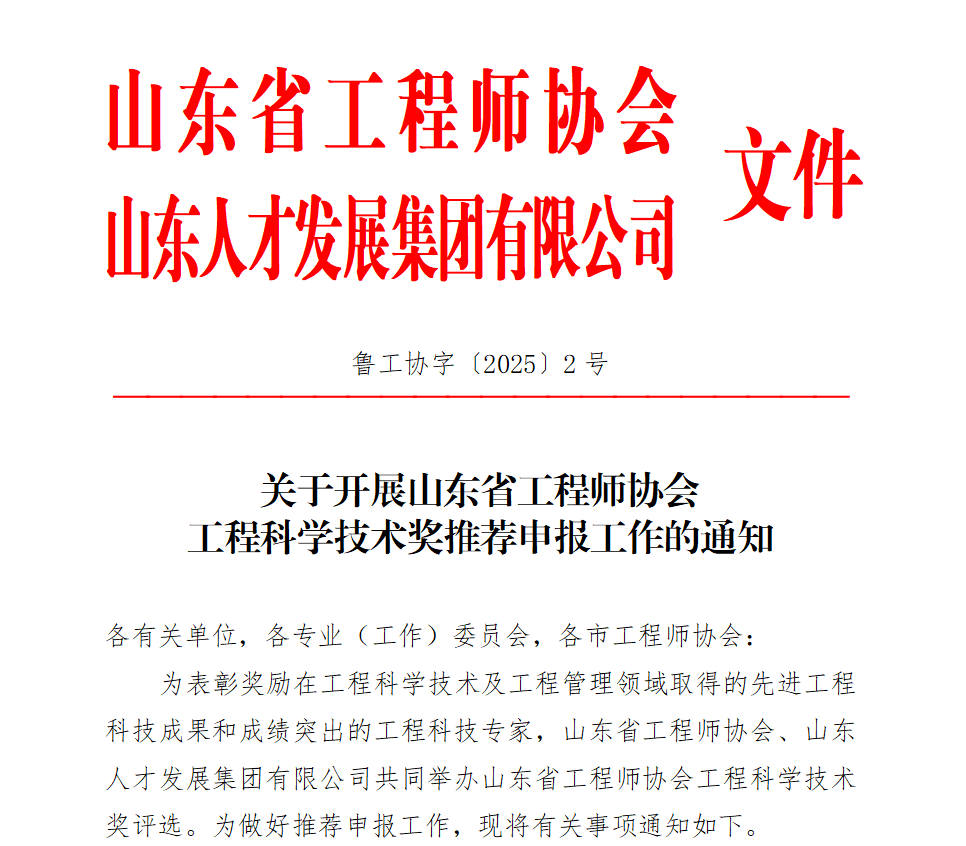 关于开展山东省工程师协会工程科学技术奖推荐申报工…