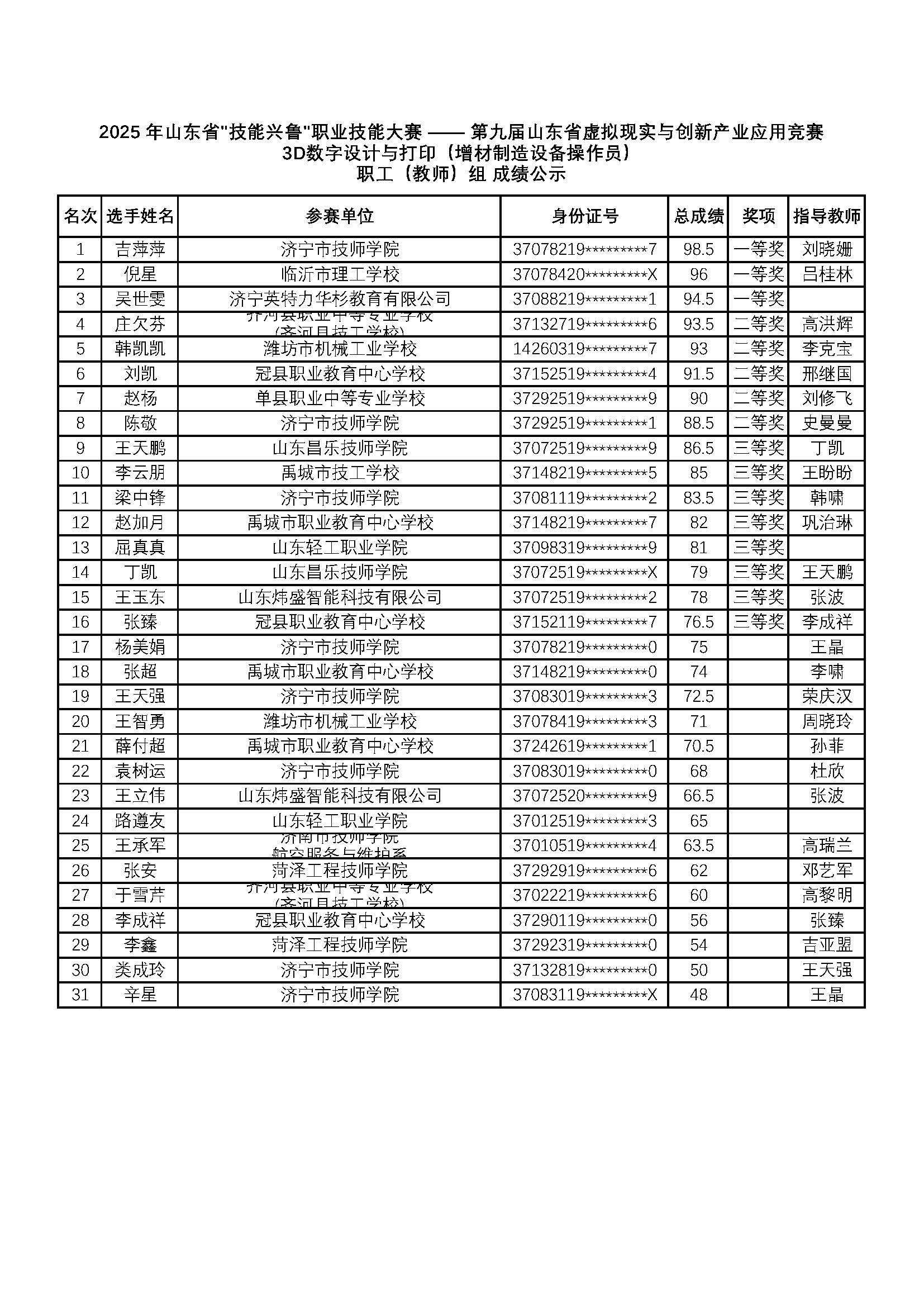2025 年山东省""技能兴鲁""职业技能大赛 —— 第九届山东省虚拟现实与创新产业应用竞赛 3D数字设计与打印(增材制造设备操作员) 职工(教师)组 成绩公示